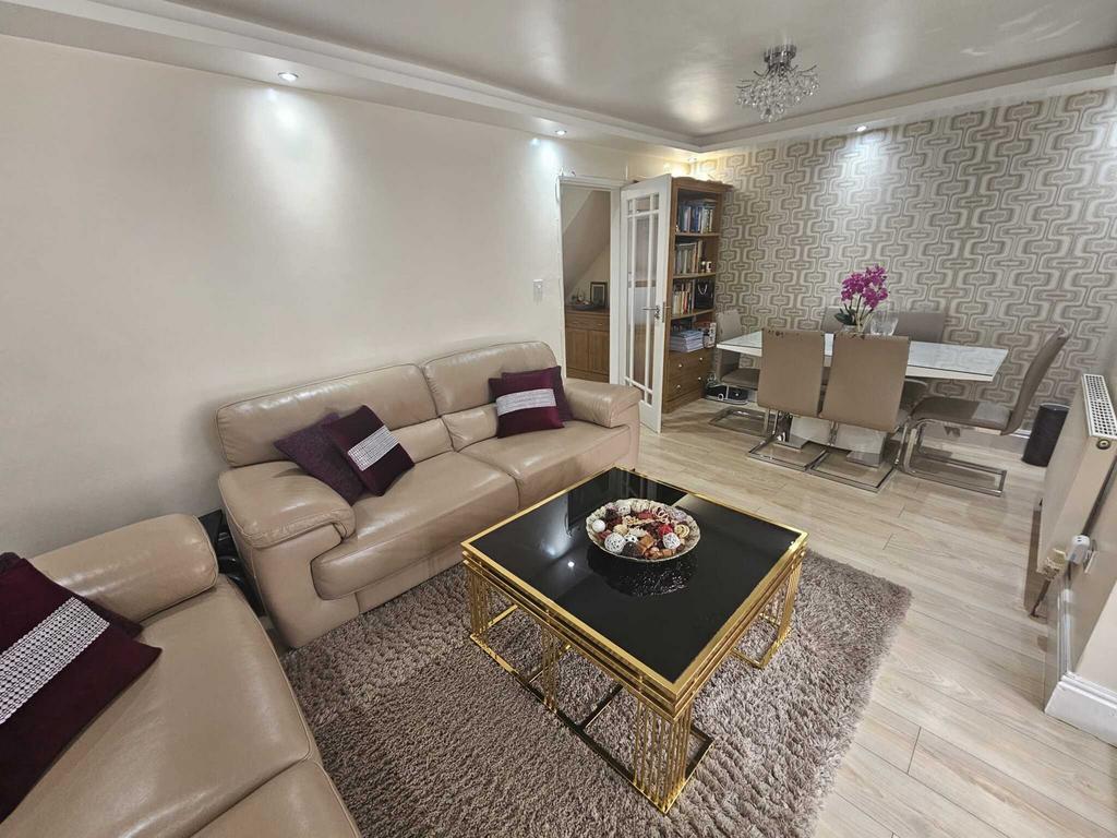 Reception Room One – A spacious living area featuring laminate flooring, spotlights, and a central heating radiator, with double doors leading into reception room two, creating an open and flexible layout ideal for family living and entertaining.