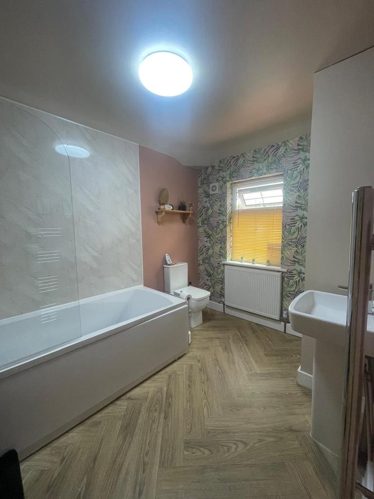 Panelled bath tub, wall mount sink with pedestal below, low level W.C, UPVC double glazed window obscure to rear elevation, vinyl flooring.