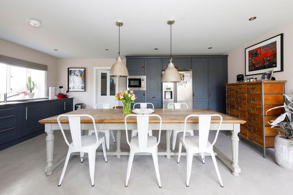This superb reception area flows seamlessly through double doors into a spacious kitchen breakfast room, beautifully appointed with a generous range of integrated appliances. The polished micro-cement flooring and sleek worktops lend a subtle contemporary edge, while glazed doors open directly onto the garden, creating a perfect link between indoor and outdoor living. A utility room offers additional storage and practicality, and there is also a stylish cloakroom on this level.