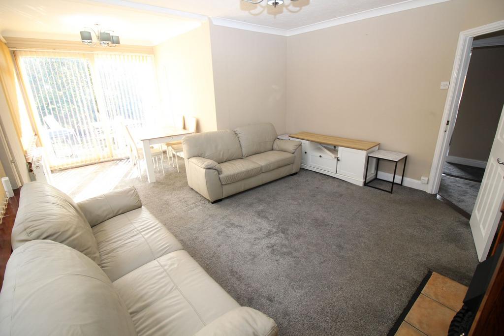 L shaped in design with maximum measurements given, decorative fire place surround, radiator, two double glazed side windows, sliding patio doors to rear garden
