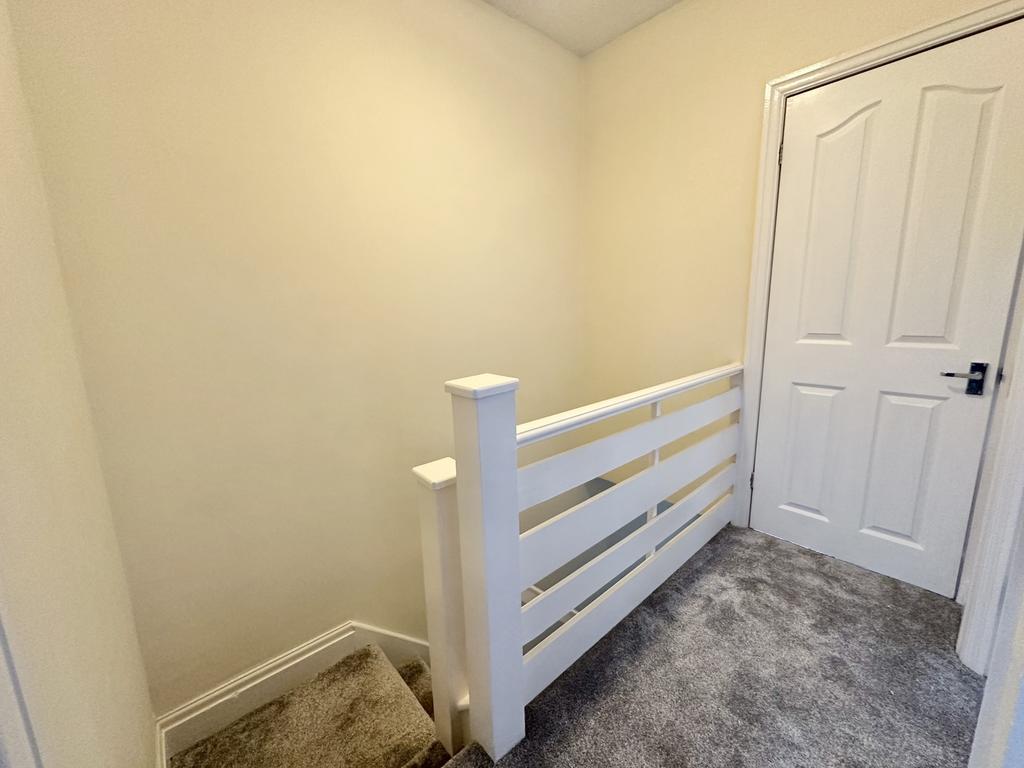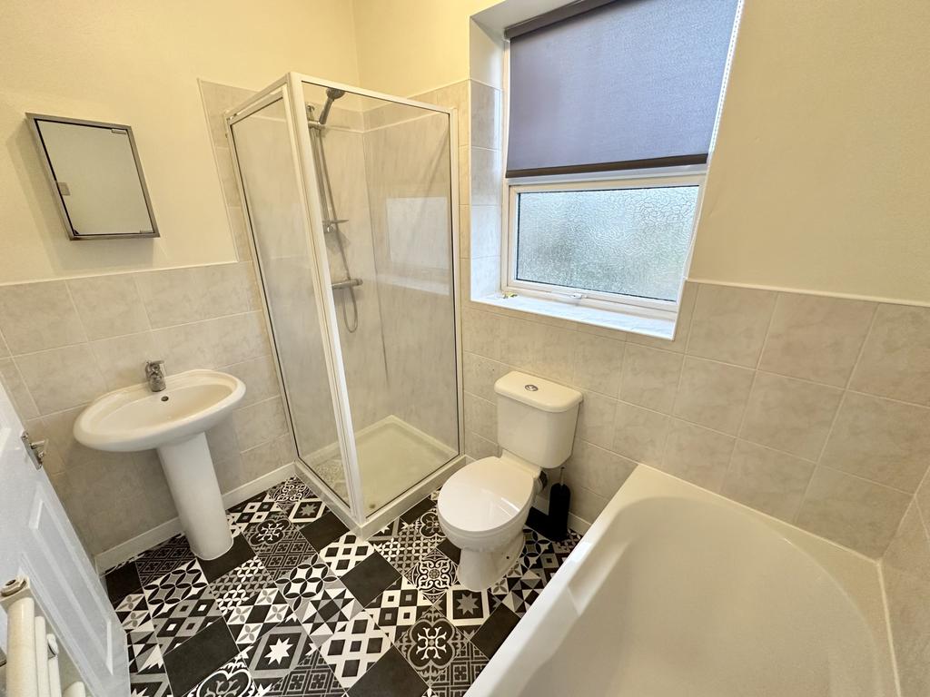 UPVC double glazed frosted window to the rear aspect, fitted with a four piece suite in white comprising; walk-in shower cubicle, panelled bath, vanity wash hand basin and low flush w.c and towel heated radiator.