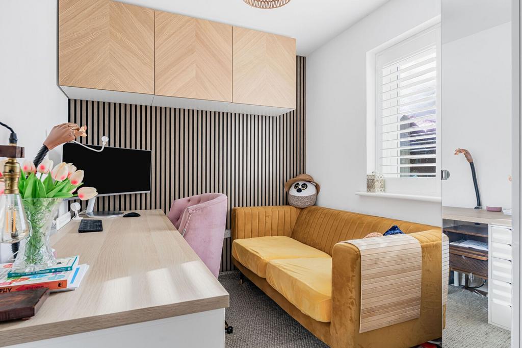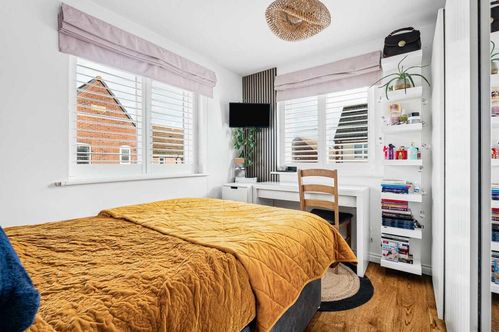 Upstairs, the home comprises two generous double bedrooms and a versatile third room - currently used as a home office but equally suited to a nursery or guest space. The principal bedroom enjoys a private en-suite with walk-in shower, while a modern family bathroom serves the remaining bedrooms. High-quality finishes continue throughout, including wooden shutters, stairs, and flooring, bringing a cohesive, timeless charm to the interiors.