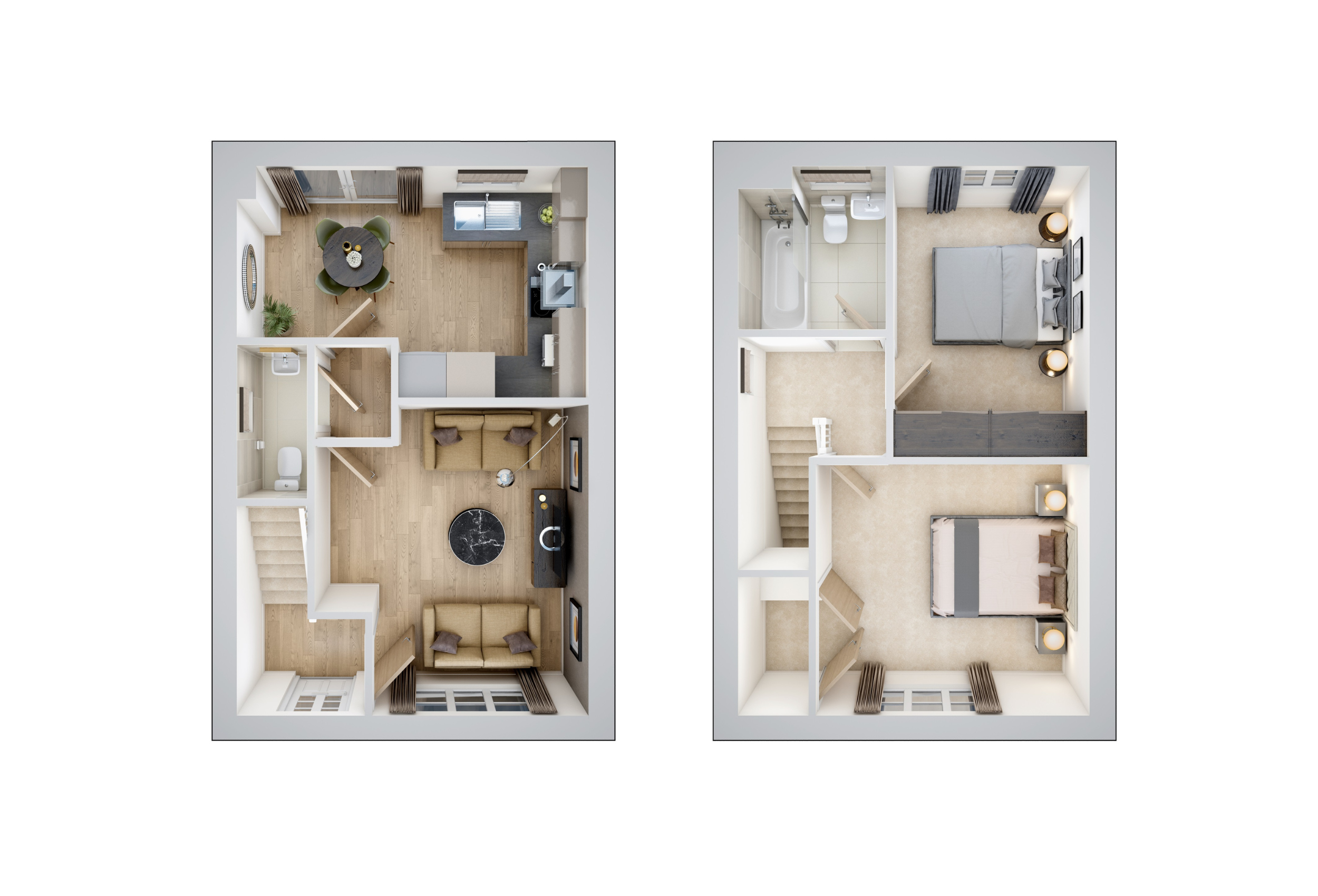 The Hawthorn features a spacious kitchen/dining area with French doors opening to the south-east facing garden, flooding the space with natural light. The kitchen includes sleek spotlights as standard, adding a modern touch. The front-aspect living room provides a perfect space for relaxing, while the downstairs WC adds practicality. Upstairs, you’ll find two large double bedrooms, one with built-in wardrobes, and a contemporary family bathroom featuring a shower over the bath and spotlights as standard. This home also benefits from two parking spaces.