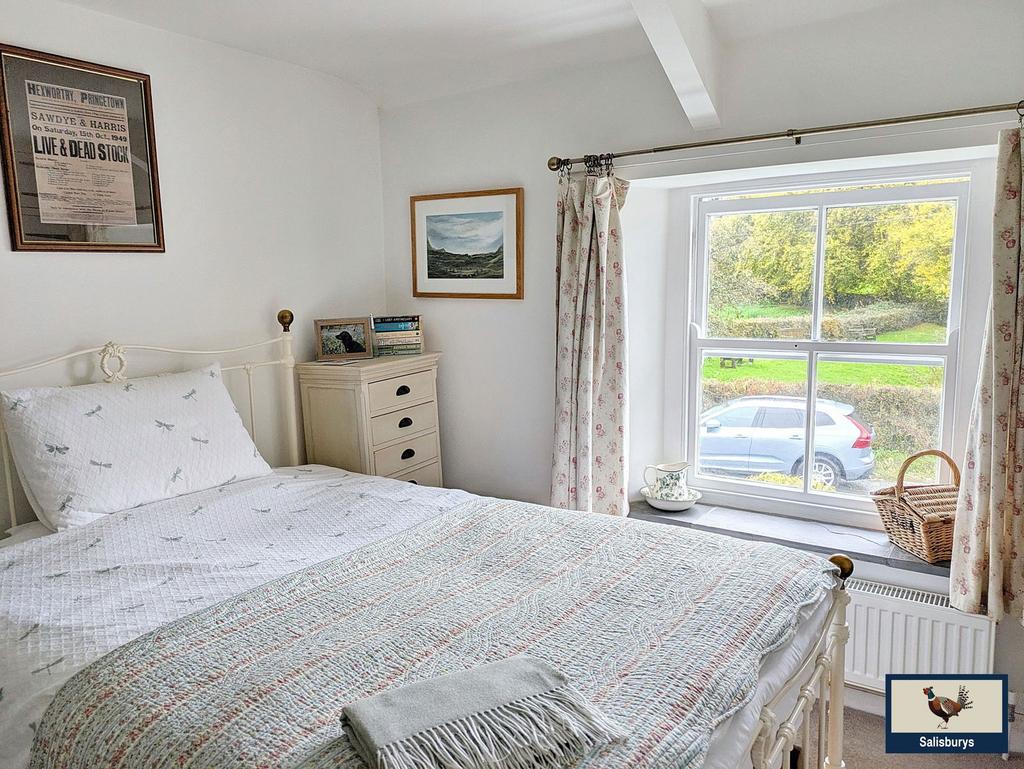 Through to the kitchen there are ample shaker style wall and base units and integrated six-place dishwasher and fridge complimented by grey worktop and splashback. The property comes with an electric Rayburn and there is also space for a fridge freezer and plumbing for a washing machine. The double glazed rear door leads into a pretty enclosed garden which catches the southerly sun and offers a quiet place to sit and enjoy the countryside.