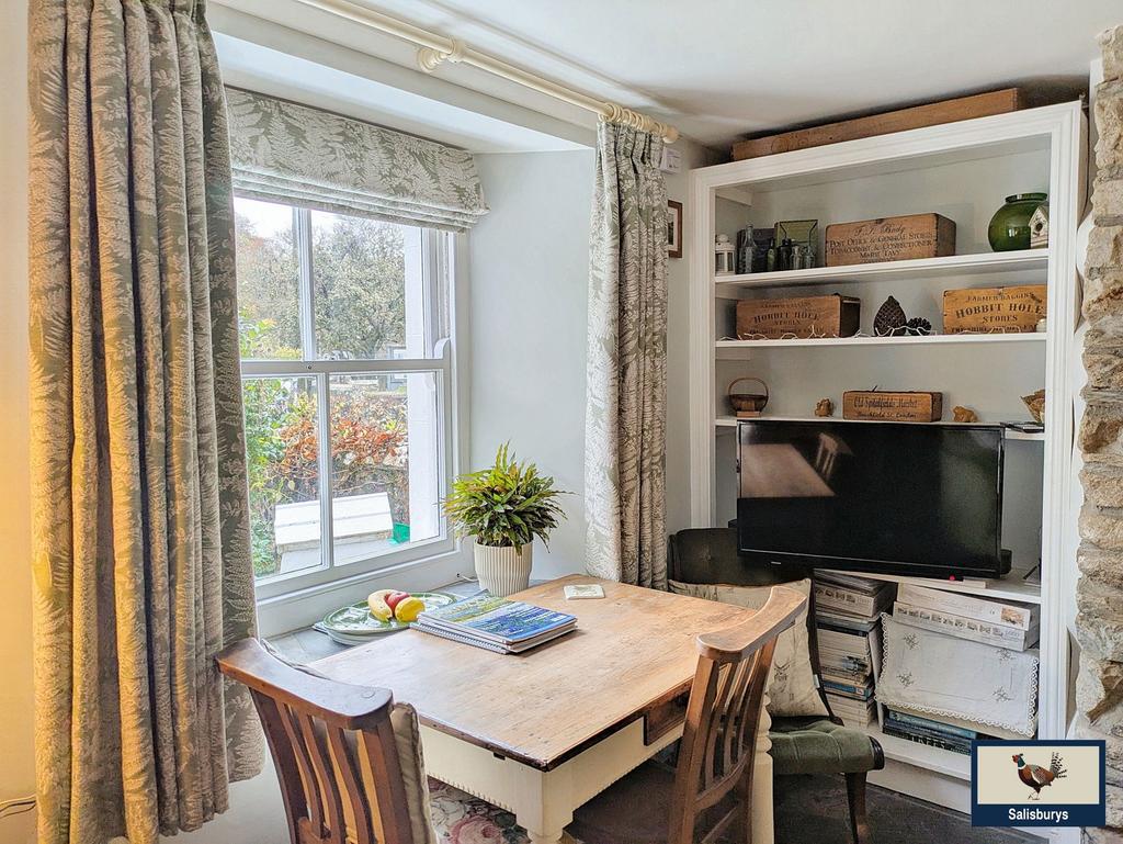 Lounge / dining room: 4.08m x 3.48m (13'5" x 11'5" ) The room is centred around a striking stone fireplace, which serves as the main focal point it houses a multi-fuel wood-burner with an oak beam above adds character, and a traditional bread oven is set within the fireplace. Built-in cupboards and shelving sit to one side, while an original single-glazed sash window overlooks the front garden.