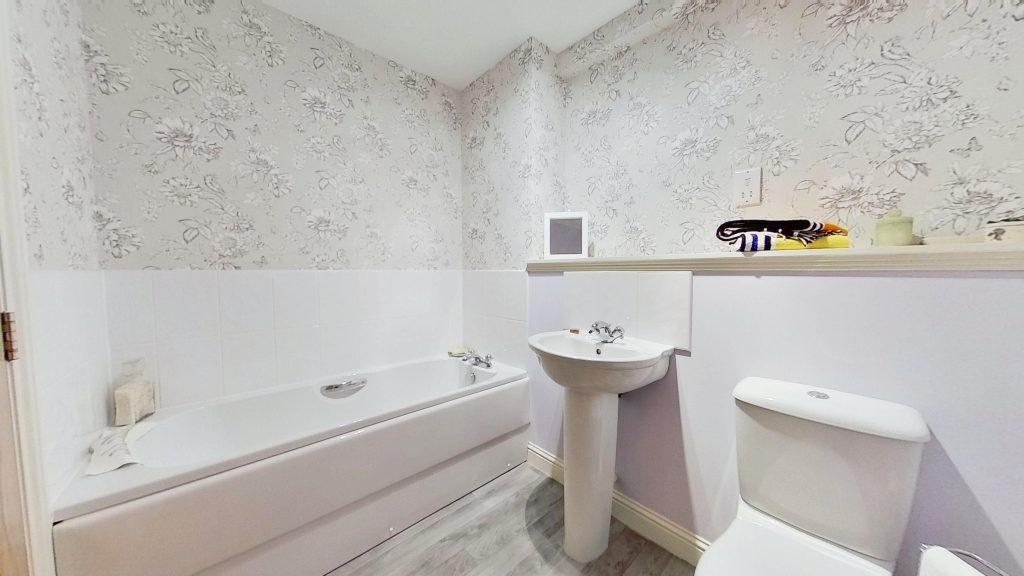 The bathroom comprises a white WC, wash hand basin, and bath, with a vanity shelf for display storage.