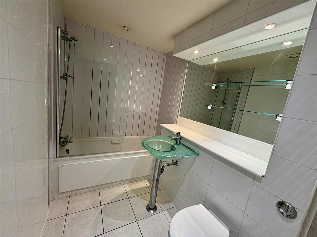 Bathroom - 2.32 x 1.69 (7'7" x 5'6") - Part tiled bathroom, Low level W.C, Hand Wash Basin, Spot lighting, fitted vanity mirror with built in shelving, Shower attachment with mixer, chrome heated towel rail, extractor fan.