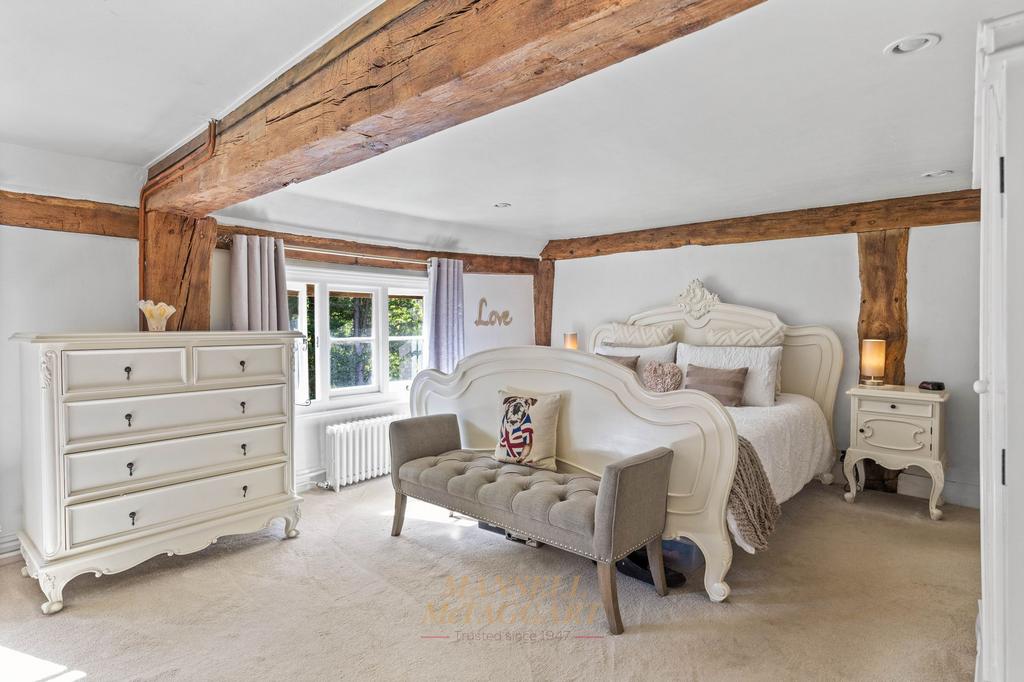 One of the two staircases is located at this end of the house and leads to a small landing with a window ahead, a bathroom to the right, and a master bedroom with a walk-in dressing area to the left. Further along, there are two further double bedrooms, 2 and 5, and the family bathroom. The first floor has characterful low ceilings, beams and exposed timbers. The master bedroom is a generously proportioned room. Currently, it features a super king-size bed with ample space for additional furniture, along with a double built-in wardrobe and a walk-in dressing area. The bathroom has the wow factor, thanks to its size and contemporary styling. There is a white suite comprising a large, free-standing oval bath with a shower attachment in the centre of the room, a WC, and a large rectangular wash hand basin with two deep, floating drawers. There are whole-height wall tiles in mid-grey, and the far wall conceals a large shower area beyond. There is a chrome ladder-style radiator, two walls with feature tiling, and a shower with a square rose and a panel of controls.