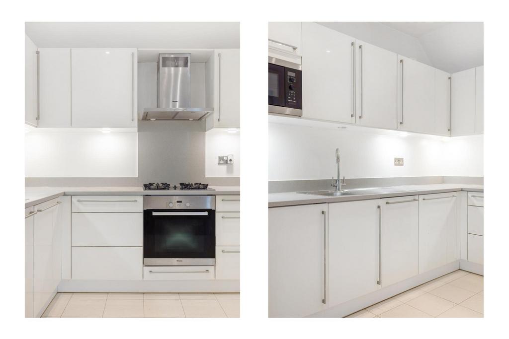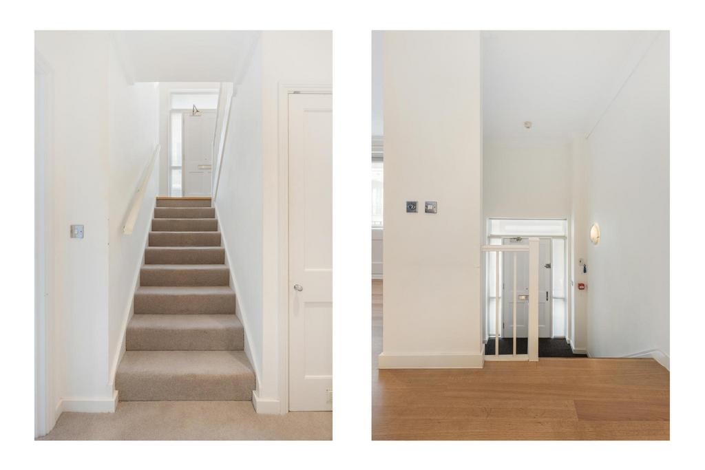 Spread across two floors, this flat comprises one bedroom, a modern bathroom, and a bright reception room. The kitchen features pristine white cabinetry and stainless steel appliances, ideal for culinary creativity. Natural light streams through expansive windows, highlighting the sleek wooden floors.