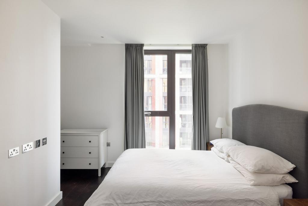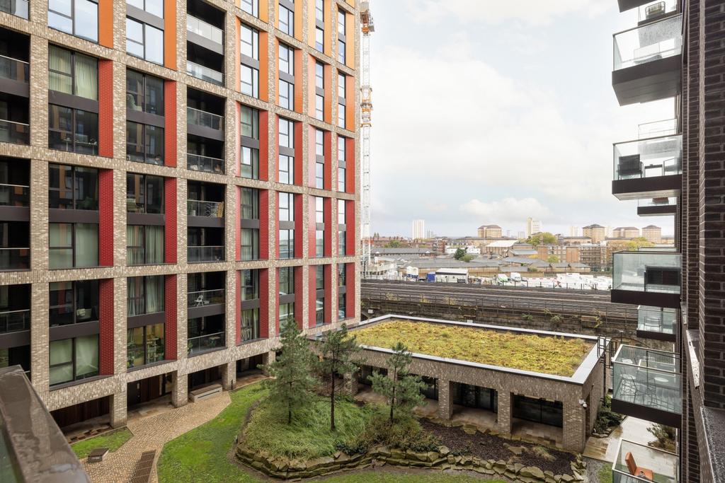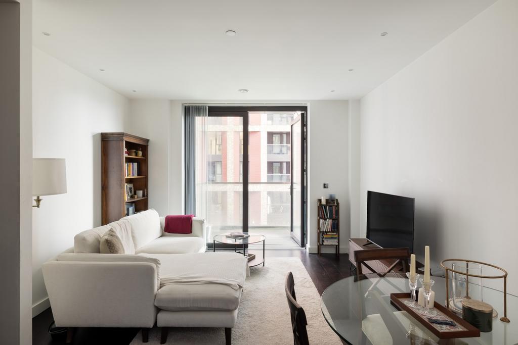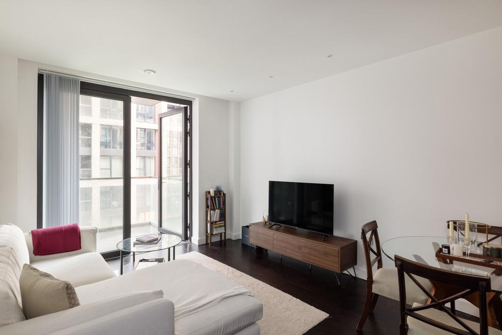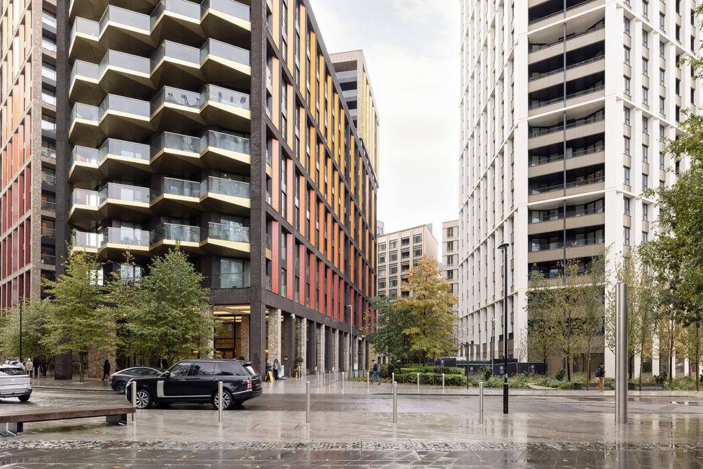 Designed by Grid Architects and inspired by New York loft living, the apartment has an open-plan layout with floor-to-ceiling windows that bring in plenty of natural light and offer views across the city. Walnut flooring runs throughout. The double bedroom includes a walk-in dressing area with built-in storage. The bathroom is finished to a high standard, and a private balcony extends the living space, with views over the podium gardens and surrounding skyline.