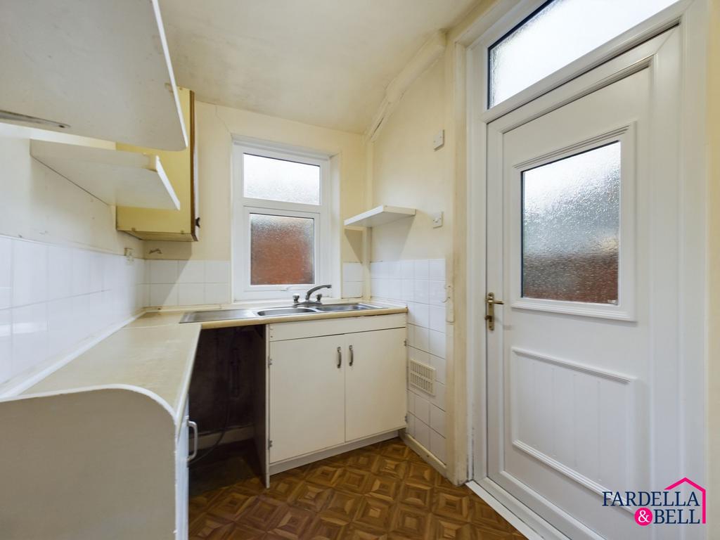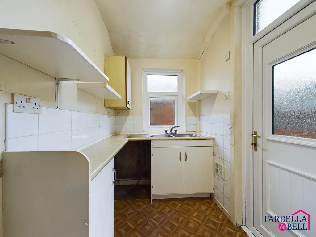 The kitchen has uPVC door to the rear yard and also uPVC double glazed window and a sink with chrome mixer and drainer and partially tiled.