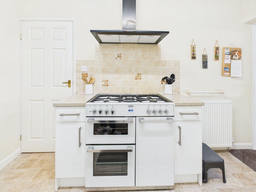 KITCHEN The modern fitted kitchen is well equipped with an array of wall mounted, base, and drawer units complemented by roll edged worktops. It includes a 1½ bowl porcelain sink with drainer, a Belling gas range style cooker, tiled splashbacks, and space and plumbing for a fridge freezer. A uPVC double glazed window and door open into the adjoining sunroom.