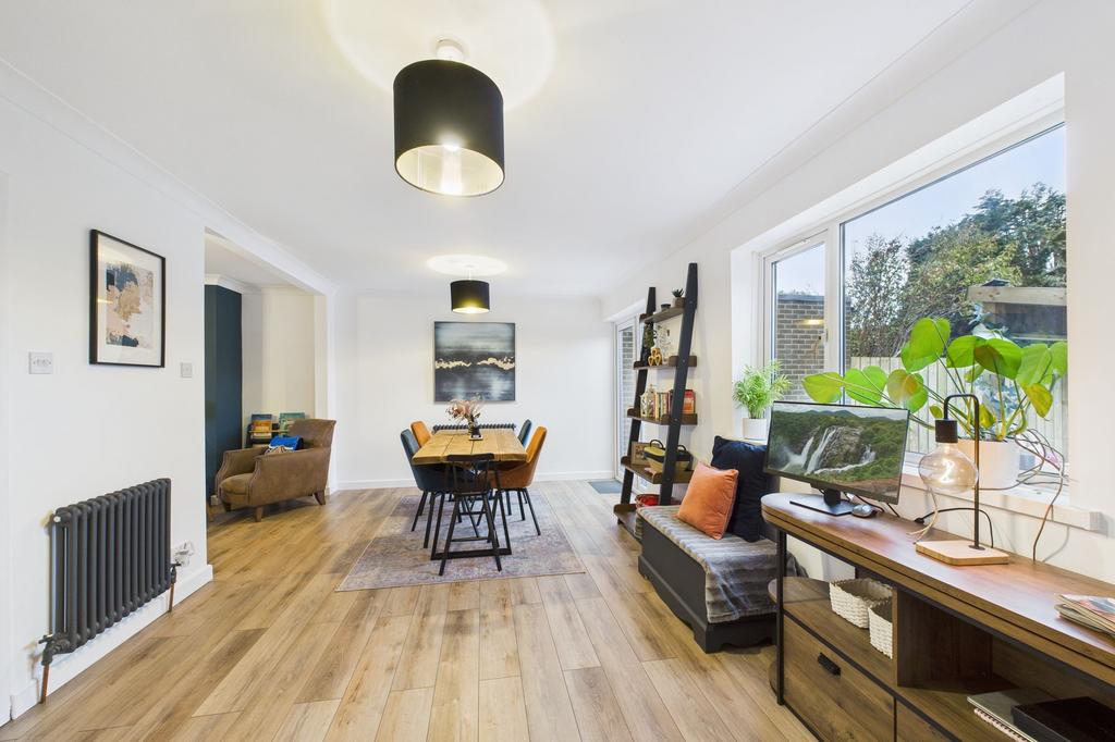 The modern kitchen is fitted with a range of integrated appliances and offers ample workspace, complemented by a breakfasting and dining area, and direct access to the rear garden.
