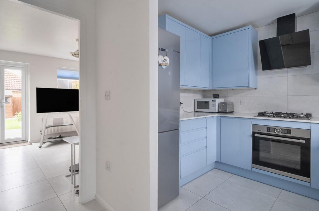 The ground floor is finished with Italian porcelain tiles and includes a stunning Wren kitchen with sleek blue cabinetry, ample storage, and space for appliances. The open plan layout is light and airy, with French doors leading out to the landscaped rear garden, which has been designed for easy maintenance with an artificial lawn, raised flower beds, a patio seating area, and a substantial garden shed. There is also convenient side access via a gated pathway.