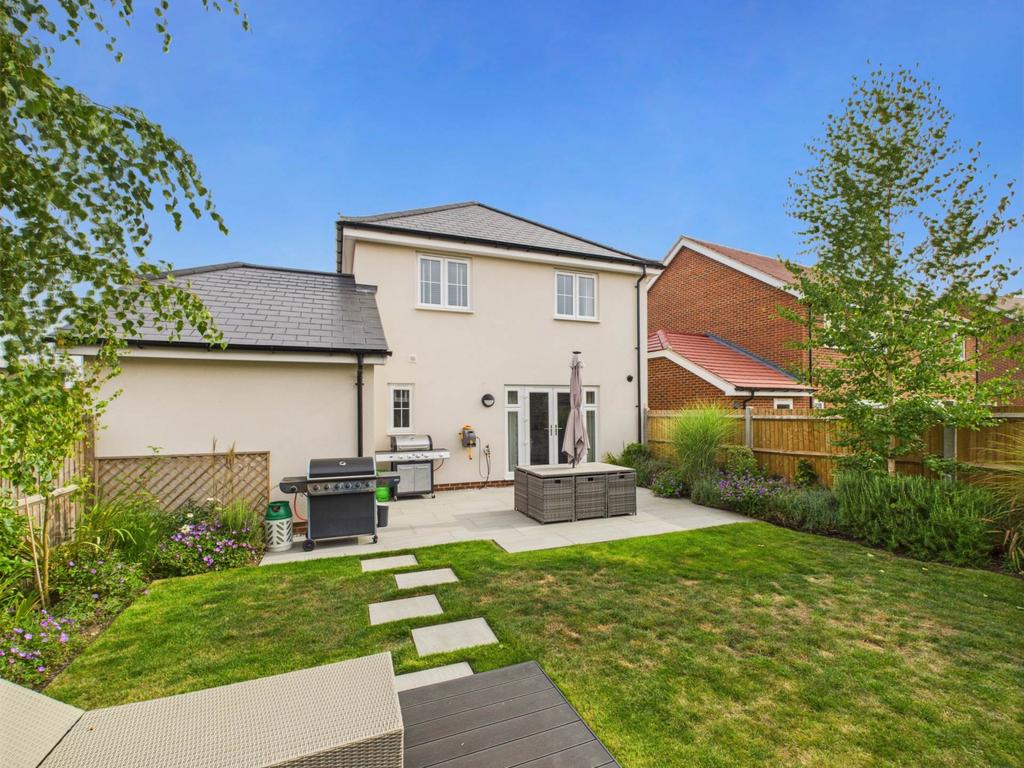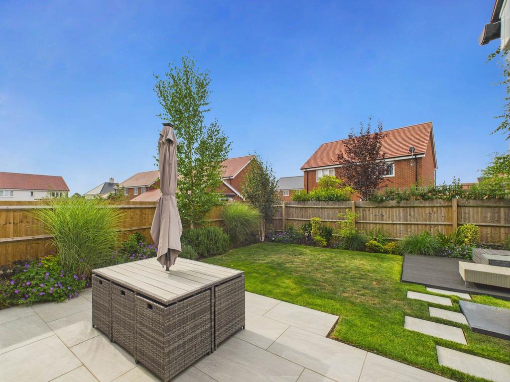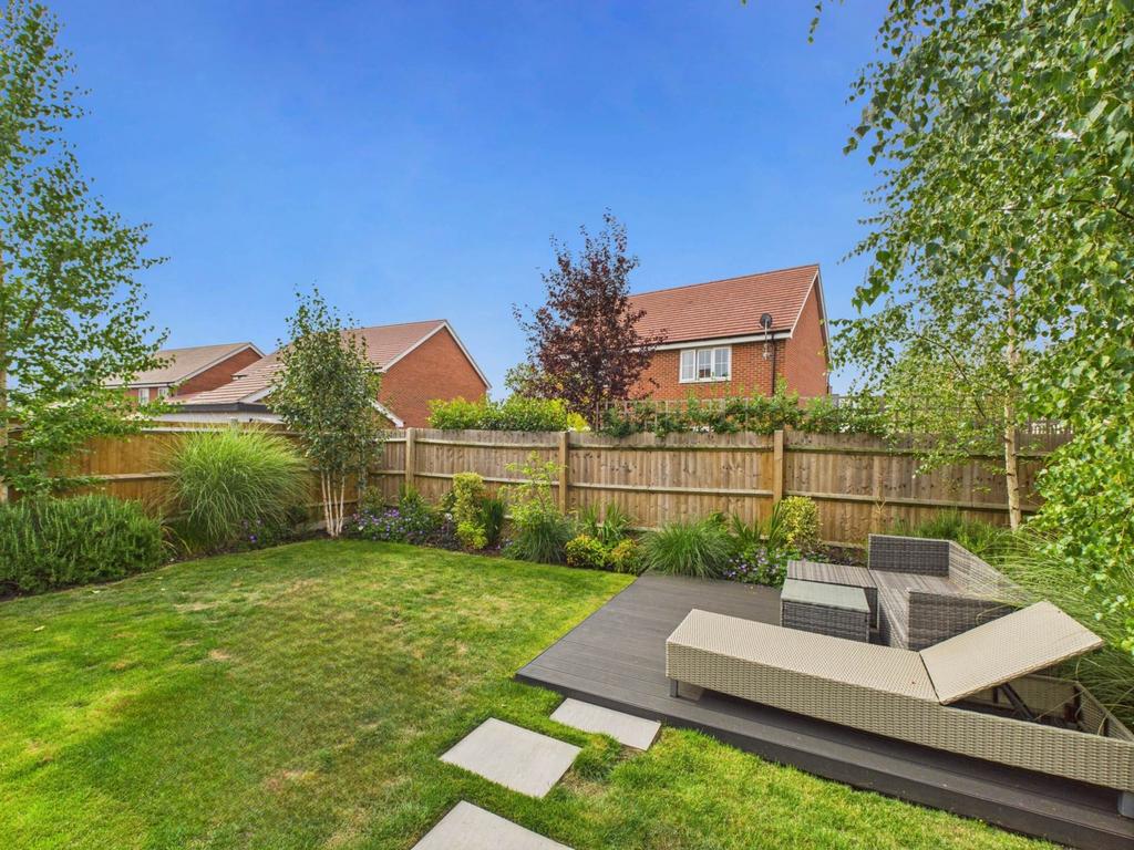 Externally, the landscaped rear garden is bordered by well-maintained plants and includes a separate raised suntrap seating area ideal for enjoying warm summer days. Additional benefits include a single garage, off-street parking, and a superb position overlooking the green and children's play area, offering an open and scenic outlook.