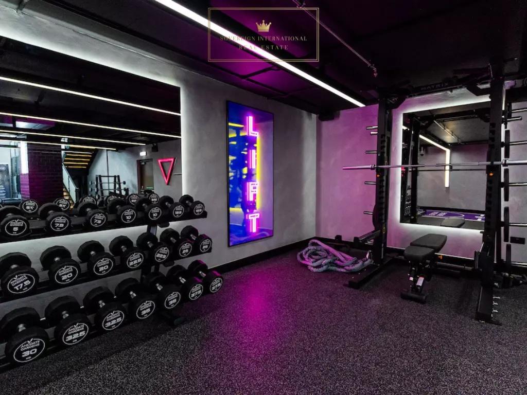 The apartment itself is finished to the highest specification, featuring bespoke furniture, exposed concrete ceilings, Minerva worktops, and Bosch integrated appliances. The heating system includes air source heat pumps with underfloor heating, ensuring both comfort and eco-friendliness.