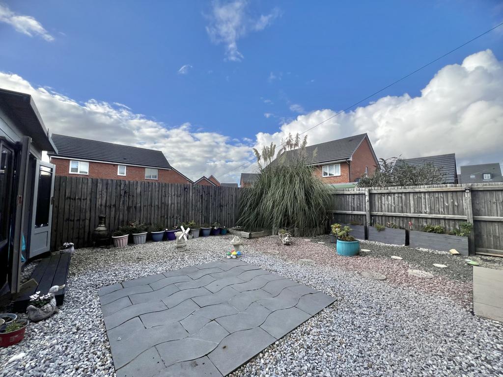 Low maintenance rear garden, summer house, mainly laid with lose stone, paved patio area and mature trees/shrubs.