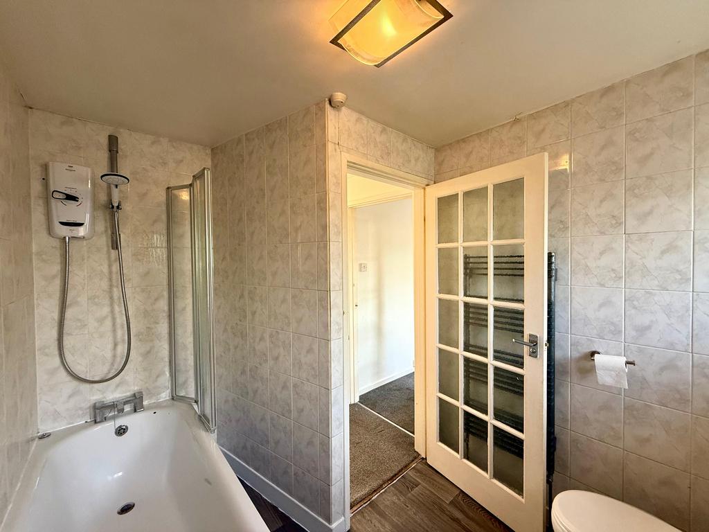 Upstairs, the main bedroom is spacious and peaceful, complete with built-in wardrobes and soft tones that create a restful atmosphere. Two further bedrooms provide flexibility for a family, guests, or a home office. The modern bathroom is fully fitted with a bath, overhead shower, WC and downlighting for a stylish touch.