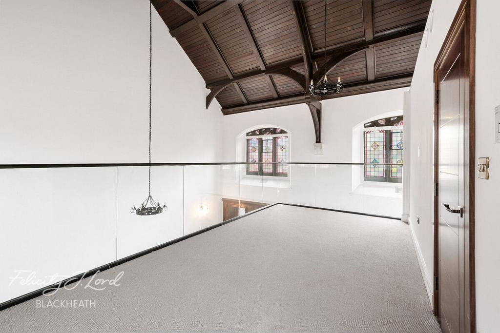 Ascending to the mezzanine level, the generous bedroom overlooks the grand living space below, providing a commanding vantage point to admire the building’s glorious architecture. There’s also an en-suite shower room finished to a superb standard, complementing the main bathroom.