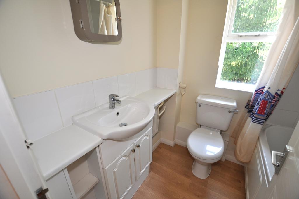 Bathroom: 6’0 x 5’5 (1.82m x 1.65m). Part tiled walls, white suite comprising panelled bath with mixer tap and hand shower attachment, vanity wash hand basin with mixer tap, low-level flush WC, double glazed window to rear, wall mounted medicine cabinet, ceiling light.