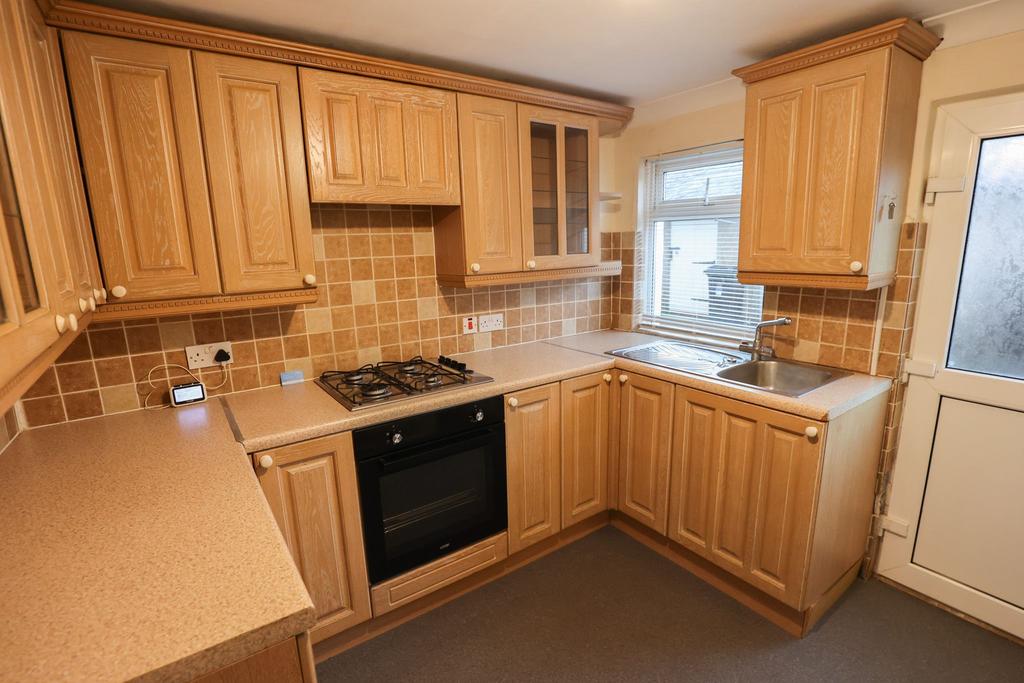 uPVC double glazed window and door to the rear elevation. Central heating radiator. Fitted base units, wall units, display cabinets and drawers with working surfaces and tiled splashbacks in part to three walls. Inset single bowl stainless steel sink. Built-in electric oven, four ring gas hob and pull out cooker hood above. Space for fridge freezer. Ceiling light. Electric power points. Electric meter and consumer unit (in wall unit). Access into: