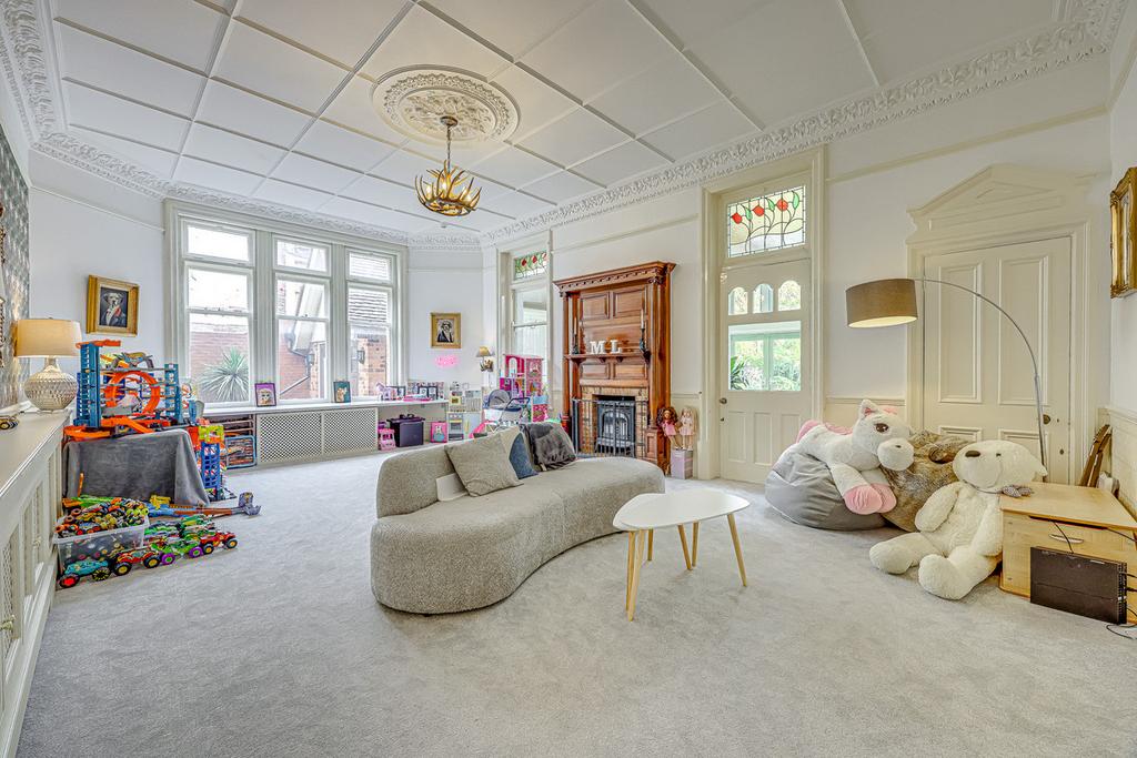 A characterful room featuring a decorative ceiling with a fitted light, and windows to the side and rear aspects that provide plenty of natural light. A door leads through to the adjoining games room, offering great flow and versatility. The space is centred around a large, ornate fireplace, adding a touch of grandeur, while radiators ensure comfort. Built-in cupboards provide useful storage, and a fitted carpet lends a cosy and inviting feel
