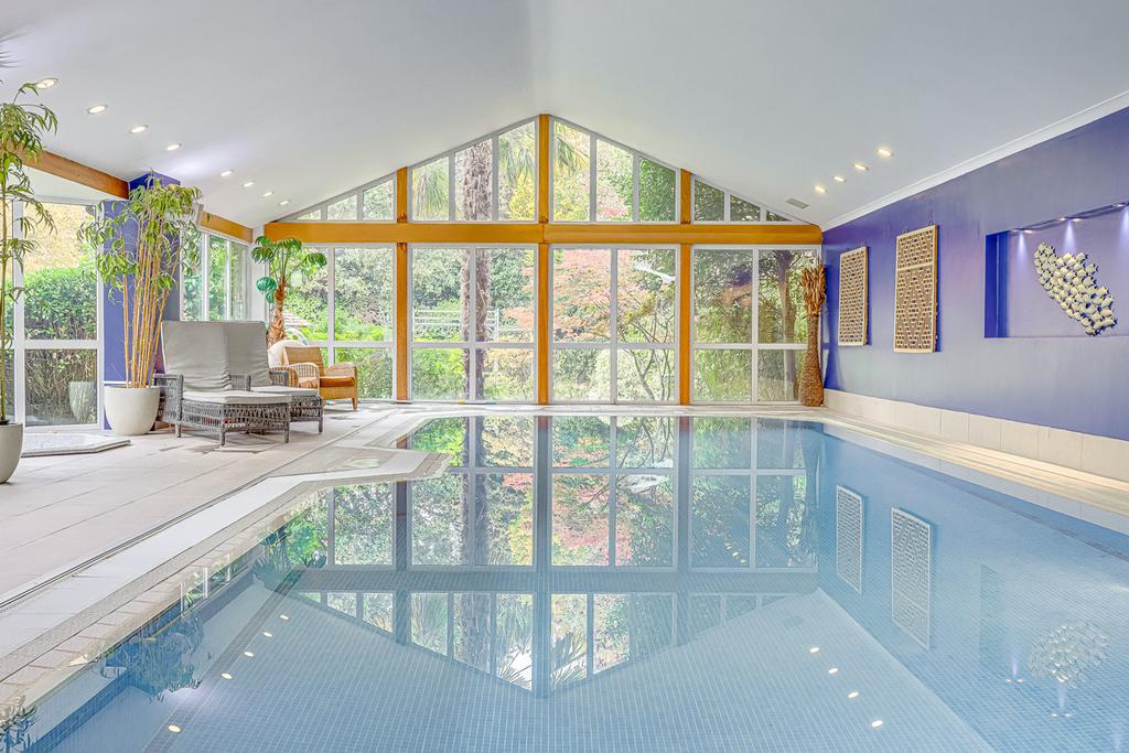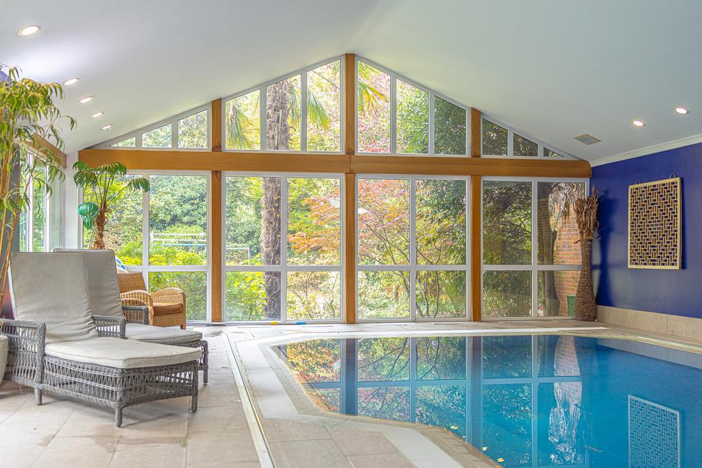 A spectacular indoor swimming pool area is a true showstopper, boasting ceiling spotlights, Velux and apex windows that flood the space with natural light, tiled flooring, and floor ventilation. French doors open to the garden, seamlessly connecting indoor and outdoor living.