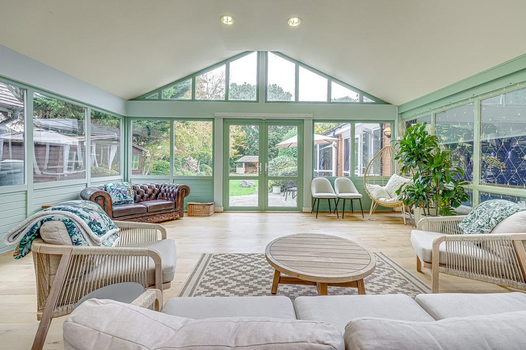 A stunning, light-filled space featuring ceiling spotlights and a double-glazed Velux window, complemented by impressive full-height apex windows to the rear that frame picturesque views and flood the area with natural light. Additional double-glazed windows and French doors to the side aspect enhance the bright, open atmosphere. The room is finished with stylish tiled flooring and benefits from floor ventilation throughout. A large heated swimming pool takes centre stage with an integrated pool cover, while a built-in jacuzzi set into the bay window creates a luxurious spot to relax and unwind