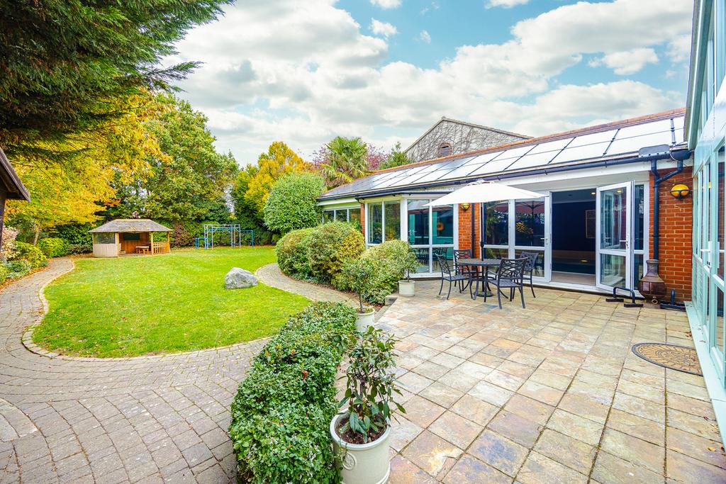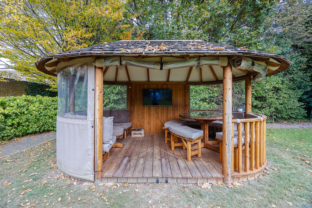 The beautifully landscaped rear garden offers a generous patio area, perfect for outdoor dining and entertaining during the warmer months. A large, well-maintained lawn stretches across the rear of the property, ideal for families or those who enjoy outdoor living. A charming brick-paved path leads to the rear of the garden, where a stunning wooden Rotunda gazebo provides a peaceful, sheltered retreat. The garden is enclosed by fencing to both sides and is bordered by a variety of mature trees and established shrubs, creating a wonderful sense of privacy and seclusion