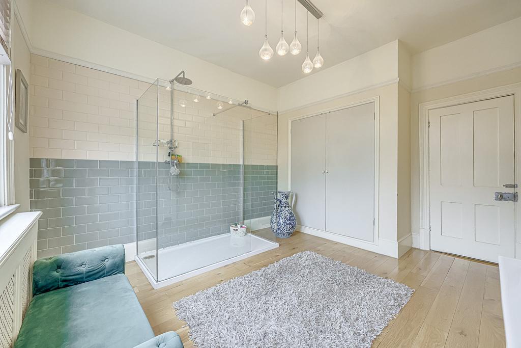A spacious and well-appointed family bathroom featuring a sink set within a stylish vanity unit and a large double walk-in shower for added comfort and convenience. The walls are part-tiled, blending practicality with style, while a radiator and heated towel rail ensure warmth. Fitted cupboards provide useful storage, and the wooden flooring adds a touch of warmth and character.