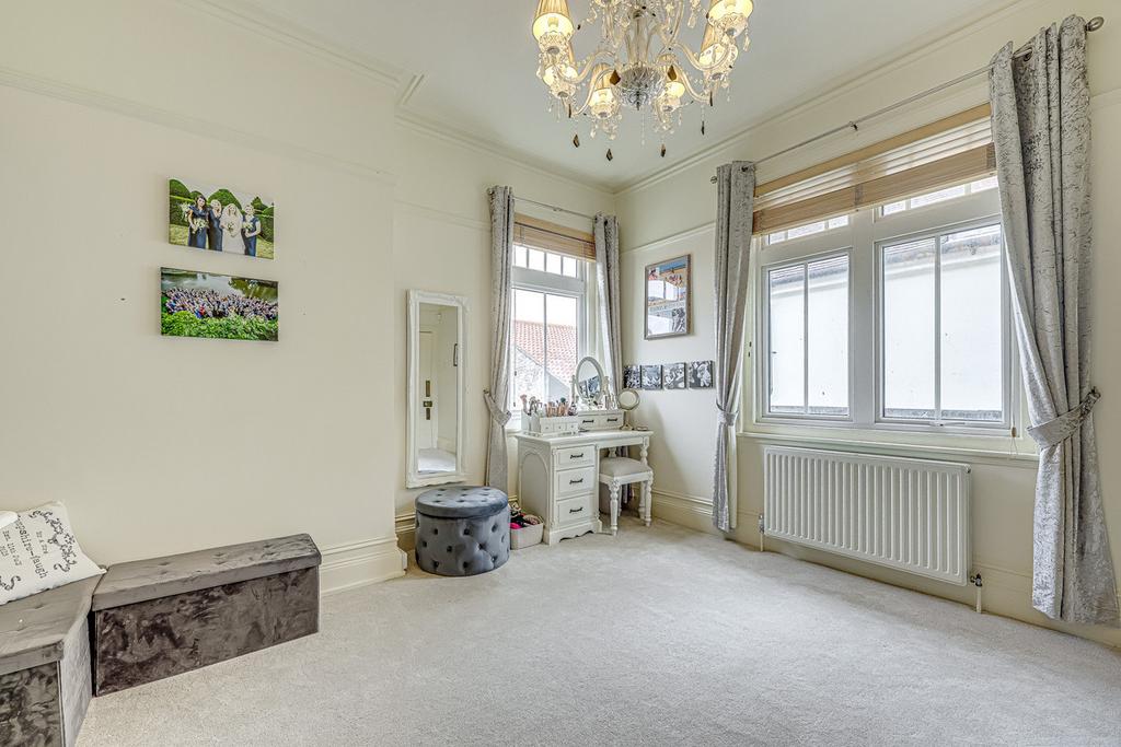 A bright and spacious room featuring a fitted ceiling light and a large double-glazed bay window to the front aspect, allowing for an abundance of natural light. An additional double-glazed window to the side enhances the airy feel. The room is warmed by radiators and centred around an attractive feature fireplace, with elegant wooden flooring adding a touch of character and warmth