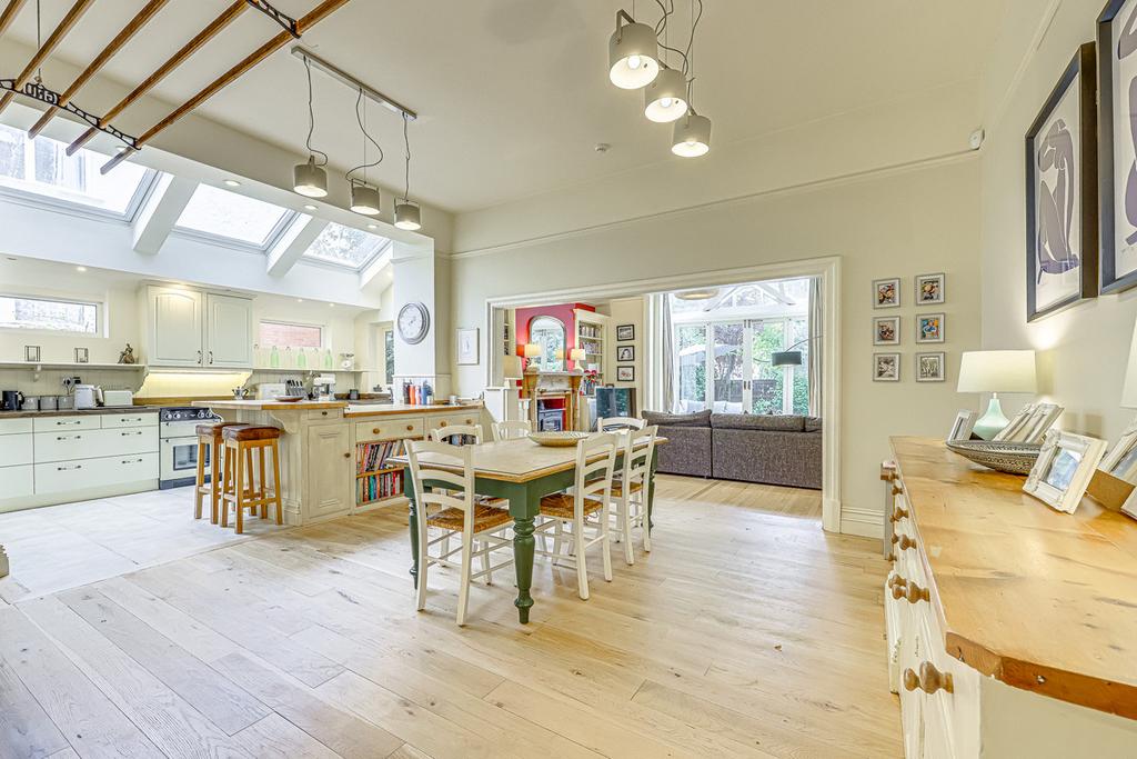 Inside, the spacious rooms are flooded with natural light from large double-glazed windows, countless Velux sky lights and feature elegant touches such as decorative ceilings, fitted ceiling lights, and feature fireplaces. Wooden flooring and fitted carpets add warmth and character throughout the home.