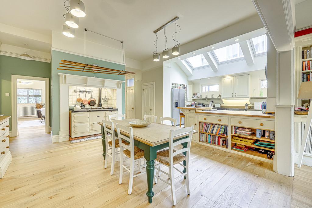 The heart of the house includes a beautifully appointed open plan kitchen dining space, complete with country-style cabinetry, solid oak worktops, and integrated appliances. Velux windows and other large windows ensure the space is bright and airy, with ample storage and designated spaces for all essential appliances.