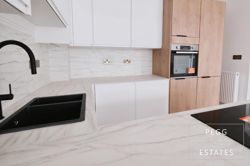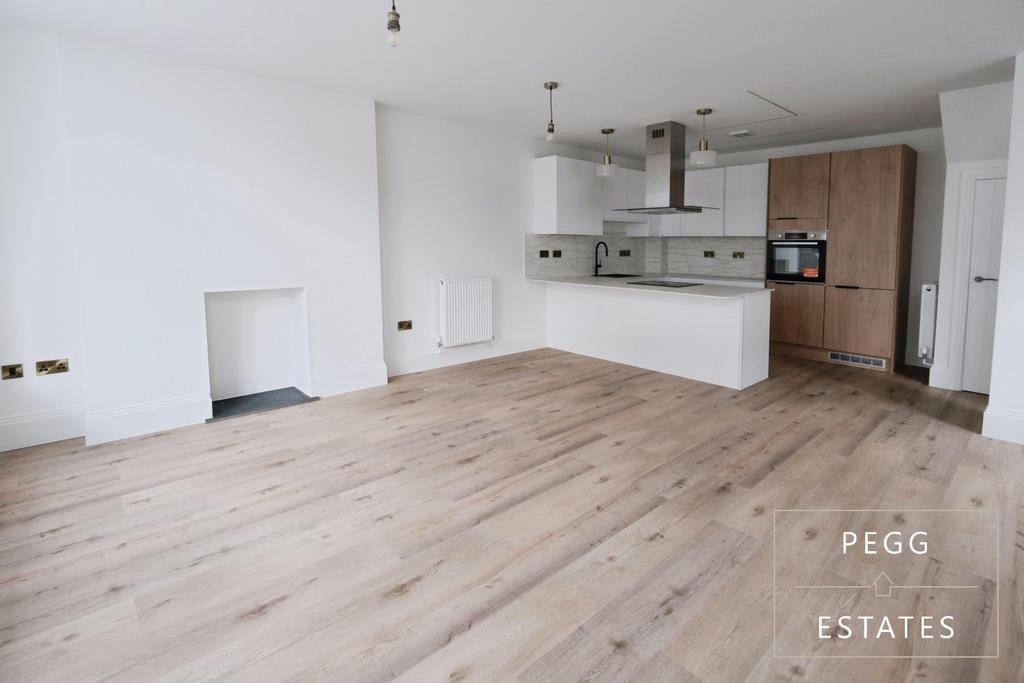 A recessed area, formerly a fireplace, offers a characterful focal point and hints at the property's period roots, while the open-plan layout allows for flexible use of space - whether that's a dining table, sofa zone or both. Pendant lights above the island help define the kitchen space and add a touch of industrial charm.