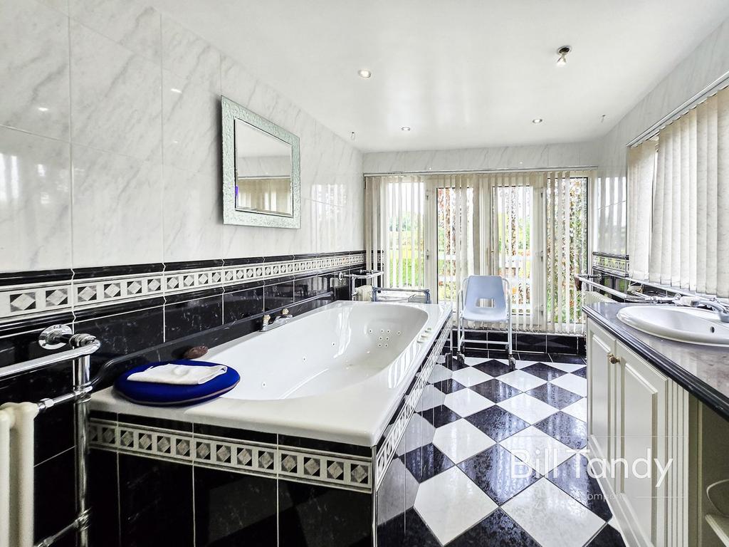 5.56m x 2.60m (18' 3" x 8' 6") having double glazed windows to rear and side, three column radiators with chrome towel surrounds, spotlighting, tiled floor, twin wash hand basins with base storage cupboards set on a marble style top with tiled surround, low flush W.C., shower pod with multi-jet system and Jetstream large jacuzzi style bath.