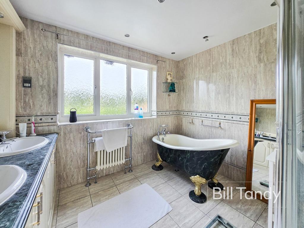 3.01m x 2.83m (9' 11" x 9' 3") having an obscure double glazed window to rear, column radiator with chrome towel surround, tiled floor, suite comprising twin wash hand basins with storage below and set on a marble top, roll top slipper bath, shower enclosure, spotlighting and full ceiling height tiling.