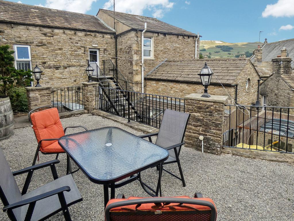 Stone terraced garden to the rear with superb views over the rooftops and hills beyond. Oil central heating tank. Two fire exit routes.
