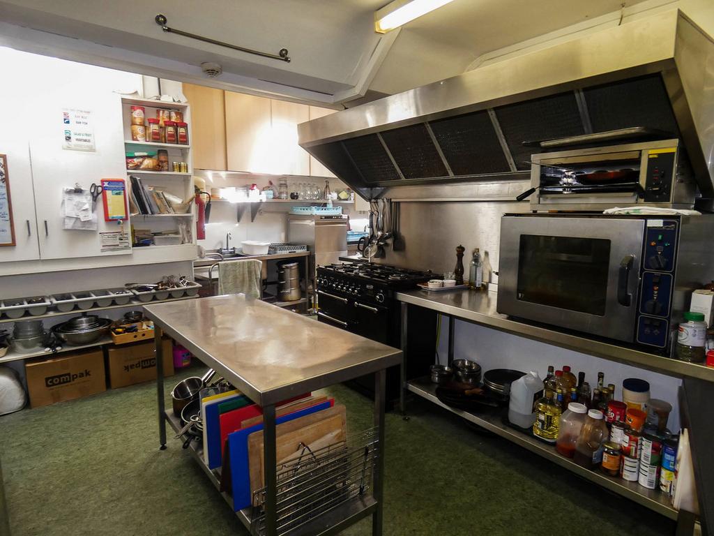 Very well equipped kitchen open through to washing area and store. Hardwearing vinyl flooring. Range of stainless steel units. Stainless steel refrigerator. Calor gas Rangemaster cooker. Large extractor fans. Commercial microwaves. Built in storage cupboards.