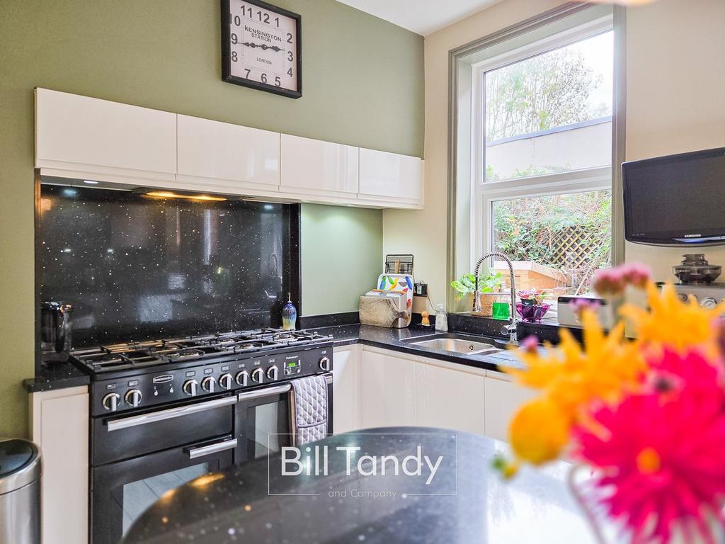 4.74m max x 3.02m (15' 7" max x 9' 11") having UPVC double glazed window to side, door to garden, column radiator, tiled flooring, a superb range of high gloss and handleless base cupboards and drawers with black quartz worktops, matching upstand splashback, inset Rangemaster one and a half bowl stainless steel sink with mixer tap, wall mounted cupboards with under-cupboard lighting, centrally positioned island with additional work top and breakfast bar area, integrated microwave, wine cooler, fridge/freezer and dishwasher and space for range style cooker.