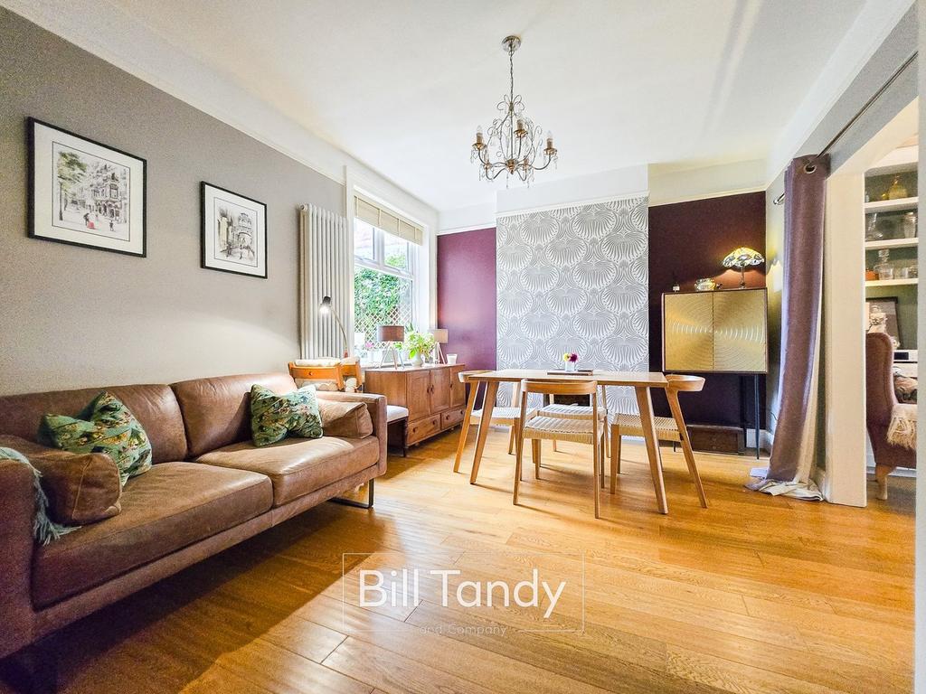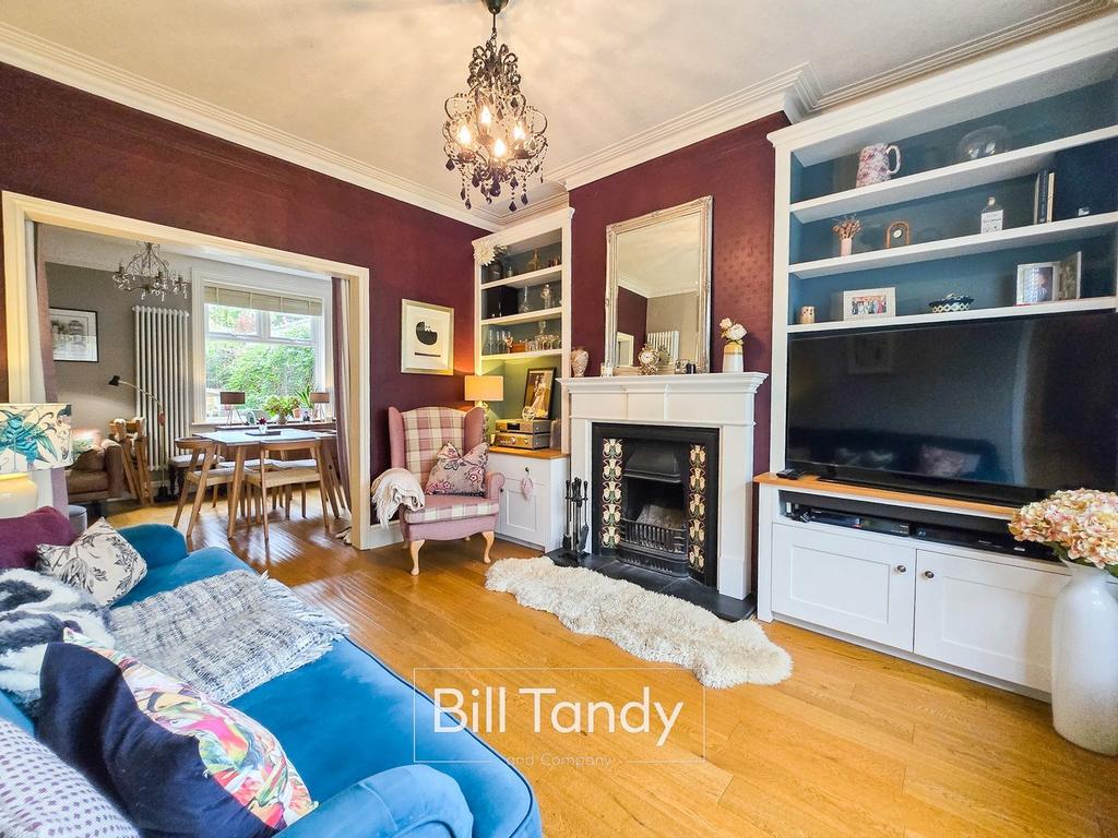 4.40mi into bay x 3.31m (14' 5" into bay x 10' 10") having double glazed walk-in bay window to front, oak wooden floor, upright designer column radiator, bespoke built-in storage and shelving, whilst the feature and focal point of the room is the stunning Victorian style fireplace with black hearth, Victorian style cast-iron tiled insert for open fire and wooden surround with mantel above. A square archway leads to: