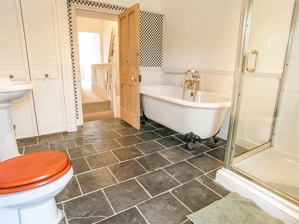 A large bathroom fitted with good quality sanitary ware comprising a double-ended, side-fed, roll top bath, glazed shower cubicle, large pedestal washbasin and close-coupled w.c.. Walls part tiled in good quality ceramics and panelled to dado height. Tiled floor. Double-glazed window. Spot lighting. Double cupboard houses Worcester gas fired combi c.h. boiler and shelving.