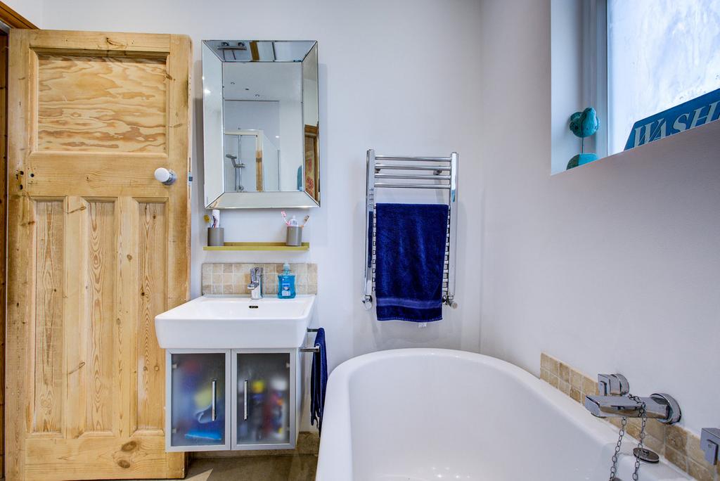 Double glazed obscure window to rear aspect, modern four piece suite comprising, floor standing bath with mixer tap, fully tiled shower cubicle, low level W.C, wash hand basin with mixer tap and vanity cupboards beneath, tiled flooring, smooth plastered ceiling with inset spot lighting, heated towel rail.