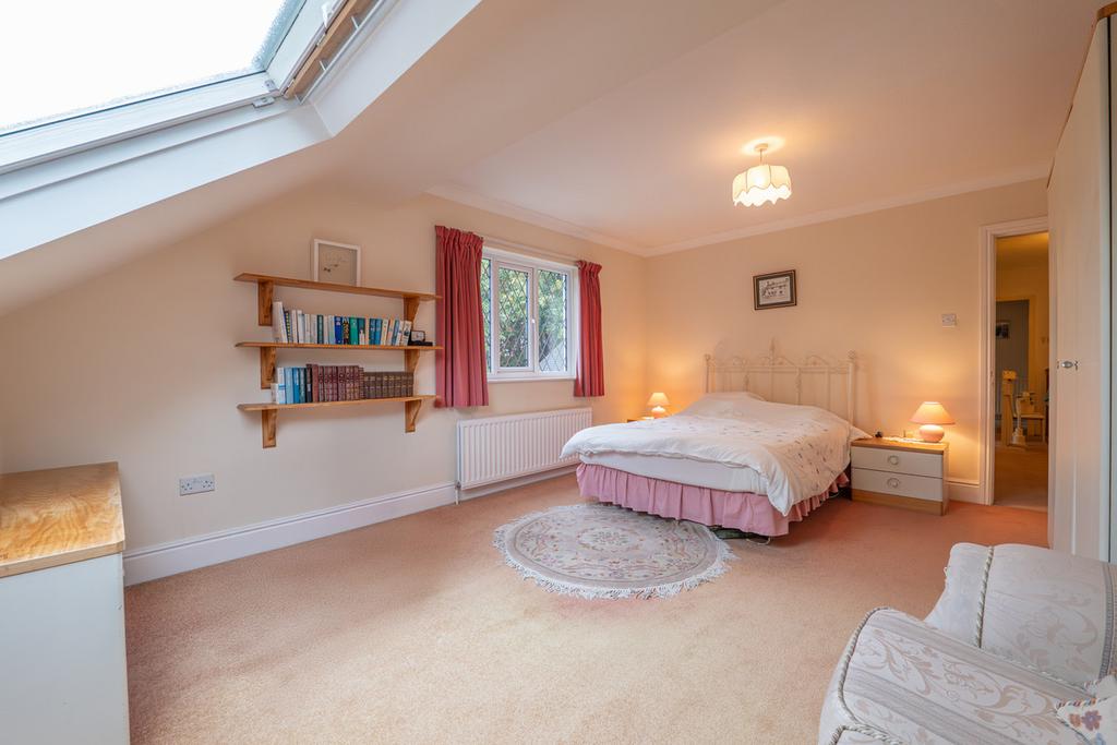 Upstairs, a wide staircase ascends to a large landing serving four comfortable double bedrooms. The principal suite is a highlight, boasting extensive fitted furniture and a large ensuite bathroom, complete with eaves storage. A spacious family bathroom serves the remaining bedrooms.