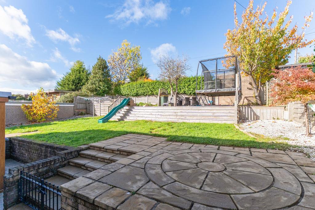 Externally, the property sits on a generous plot with excellent outdoor space. To the front is a driveway providing off-road parking and access to the garage, with steps leading up to the main entrance. The rear garden is beautifully presented and features a large lawn area as well as a decked seating space, perfect for outdoor dining, entertaining, or simply enjoying the tranquil surroundings.