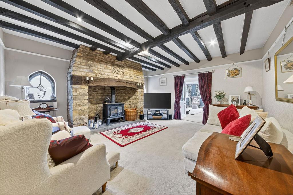 Sitting room with a feature ingle nook stone fireplace with a wood burning stove, exposed beamed ceiling and stone mullion windows.