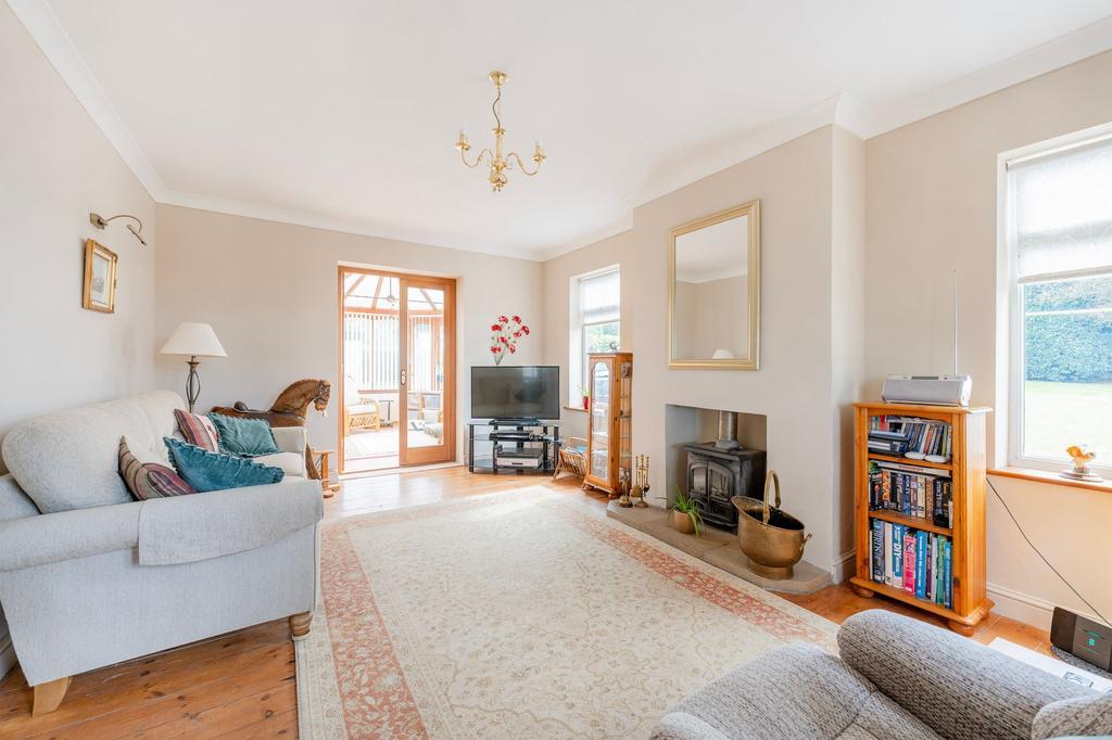 To the left of the entrance hall, the dining area is anchored by a central chimney breast with a recessed cast iron multi-fuel burner on a raised hearth, combining both style and comfort. This space flows effortlessly into the well-appointed kitchen, which is fitted with a coordinated range of cream wall and base units, and complemented by a wood burner, perfect for both everyday family life and entertaining.