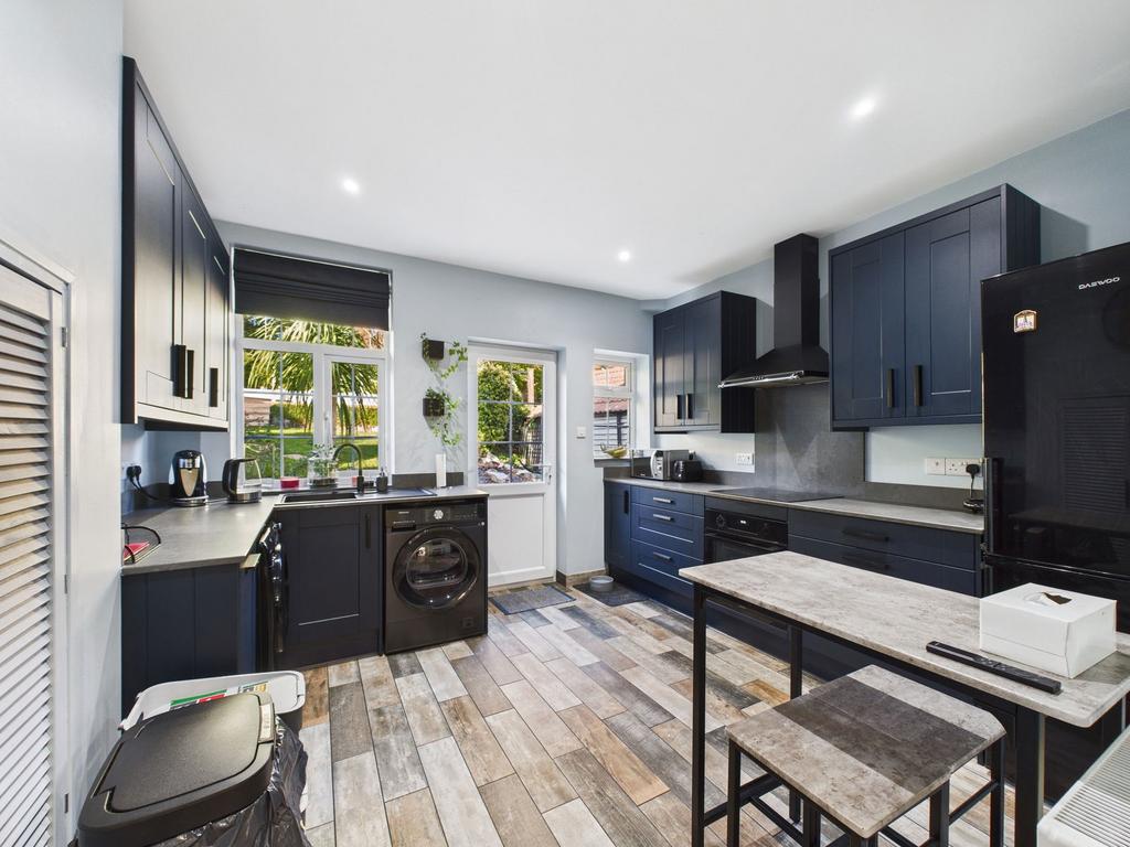A beautifully fitted range of Wrens wall and base units finished in a luxurious deep blue and topped with quartz counter tops. Fitted Zanussi ceramic hob with cooker hood over and oven/grill below. Space for fridge freezer. Plumbing and space for for washing machine and tumble dryer. Integrated Matrix dishwasher plus L.E.D under cabinet lighting. Radiator. Useful larder cupboard. Wood effect floor tiling. Two double glazed window and door overlooking rear garden. TV point. Spot lights to ceiling.