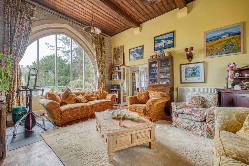 The garden opens into a series of beautifully arranged spaces including a broad stone terrace adjoining the garden room and providing the perfect spot for al fresco dining, bordered by colourful beds and potted plants. Beyond, a lawn sweeps away from the house, edged with mature shrubs, herbaceous borders and specimen trees that provide seasonal interest and structure throughout the year.