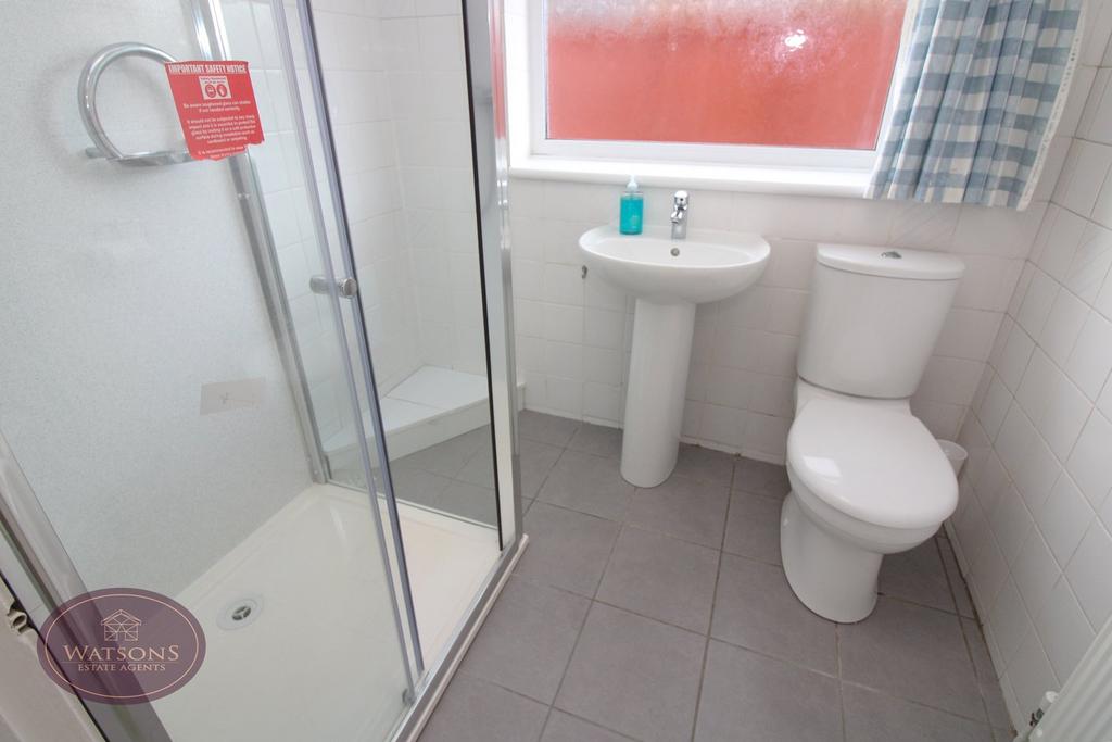 White three piece suite comprising wc, pedestal sink and mains fed cubicle shower. Obscured uPVC double glazed window to the side, tiled flooring, tiled walls and radiator.