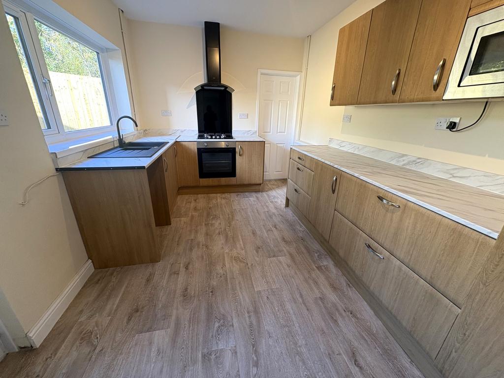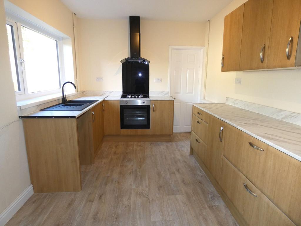 Upvc double glazed window and door to side, plastered walls, plastered ceiling, laminate flooring, fitted wall and base units with integrated gas hob, electric oven, chimney style extractor, microwave oven and composite double sink and drainer with mixer tap. Radiator, power points, space for white goods, access to bathroom and rear garden.